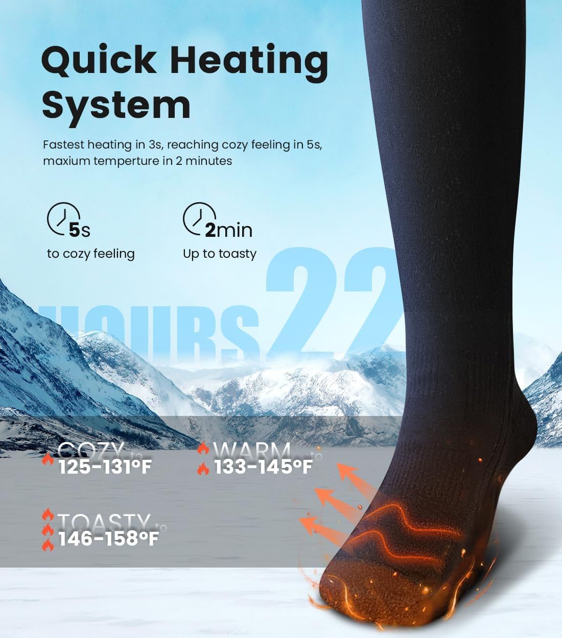 [COMFORTABLE AND DURABLE]- Our heated socks are made of high-quality fabric, ensuring superior comfort and performance. Breathable material prevents moisture buildup and odor, ensuring your feet stay fresh and comfortable. Plush cushioning not only adds warmth but also provides long-lasting wear resistance. The stretchy material provides critical arch support, while the knitted construction maintains breathability. Non-slip cuffs ensure your socks stay securely in place during all activities.