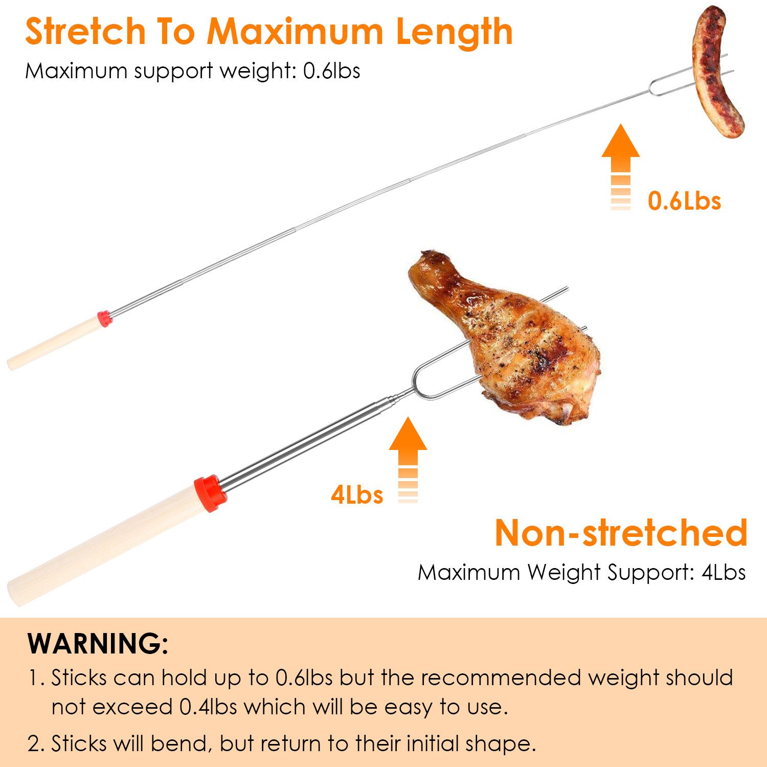 **Telescoping Fork Skewers*:Extendable skewer handle is pretty tight in each layer of the stainless steel rod,extend like an antenna until twice times in length. The roasting sticks can extend up to 31.9in and hold up the weight of sausages,hot dogs,veggies,marshmallows