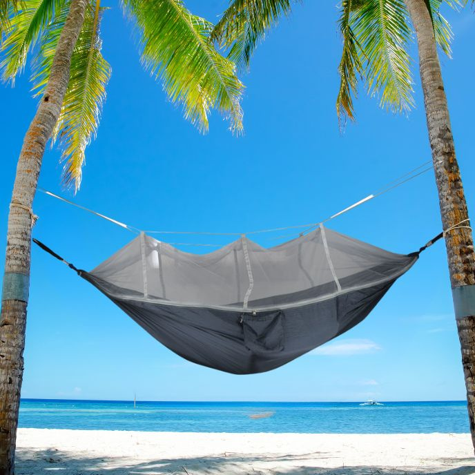 Seamless Outdoor Sleeping Hammock With Mosquito NetHammock Material: 210D nylon fabric (Parachute cloth)Mesh Material: High-Density NetSpecifications: 102in × 55.18inNet Weight: (1.43lb)Maximum Support Weight: 660lbs (300kg)Accessories:2m strap × 24m draw rope × 2Color Options: 14 colors availableApplicable Scenarios: Picnics, outings, camping, etc.Features:High-Quality Mesh Protection: High-density mesh prevents mosquitoes from entering, ensuring a comfortable and breathable outdoor experience.Easy Setup: Simple strap and rope installation allows for quick setup between trees.Lightweight & Portable: Weighing only 650g (1.4lb), it’s easy to carry for camping, hiking, and beach trips without adding bulk.Adjustable Strap System: Standard 2m strap allows for flexible tree distance adjustments, enhancing convenience.User-Friendly Installation: Mosquito net design enables hassle-free setup—just wrap the straps around trees, tighten, and enjoy.