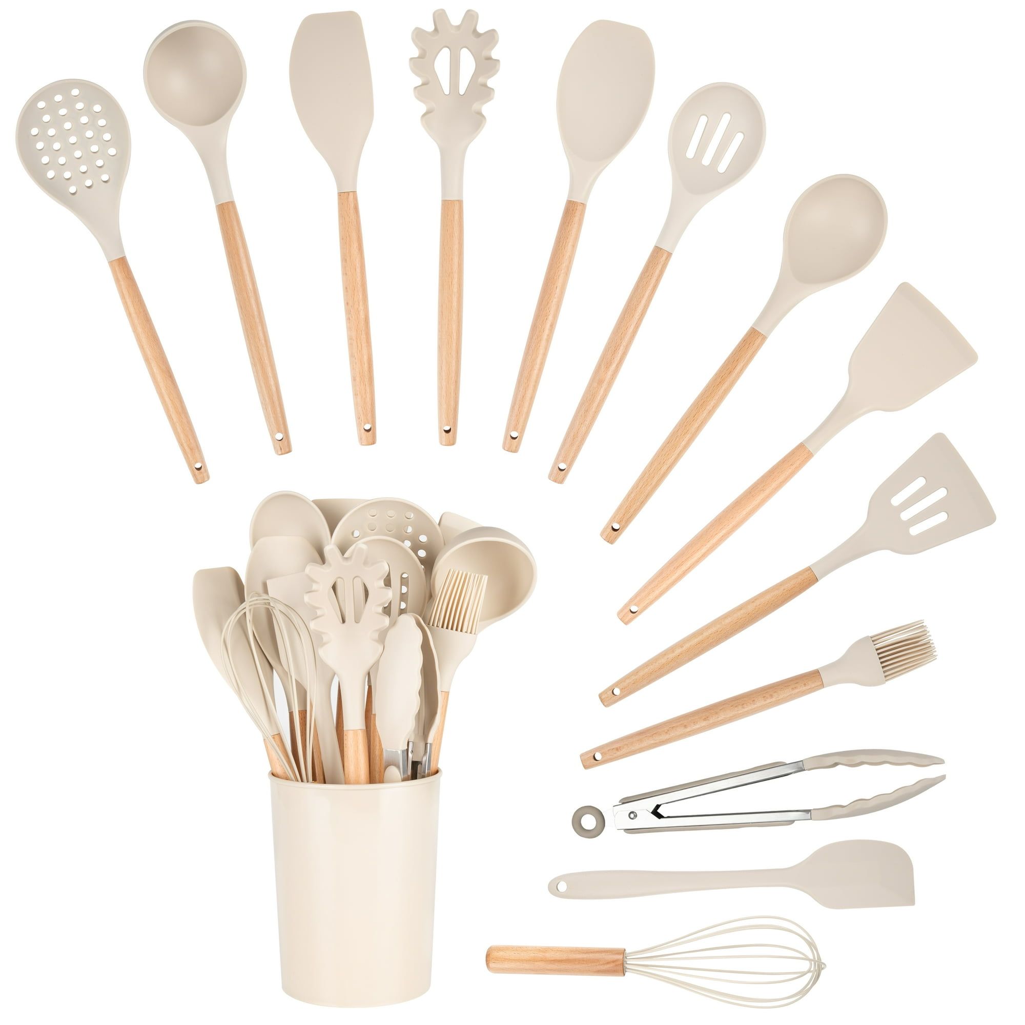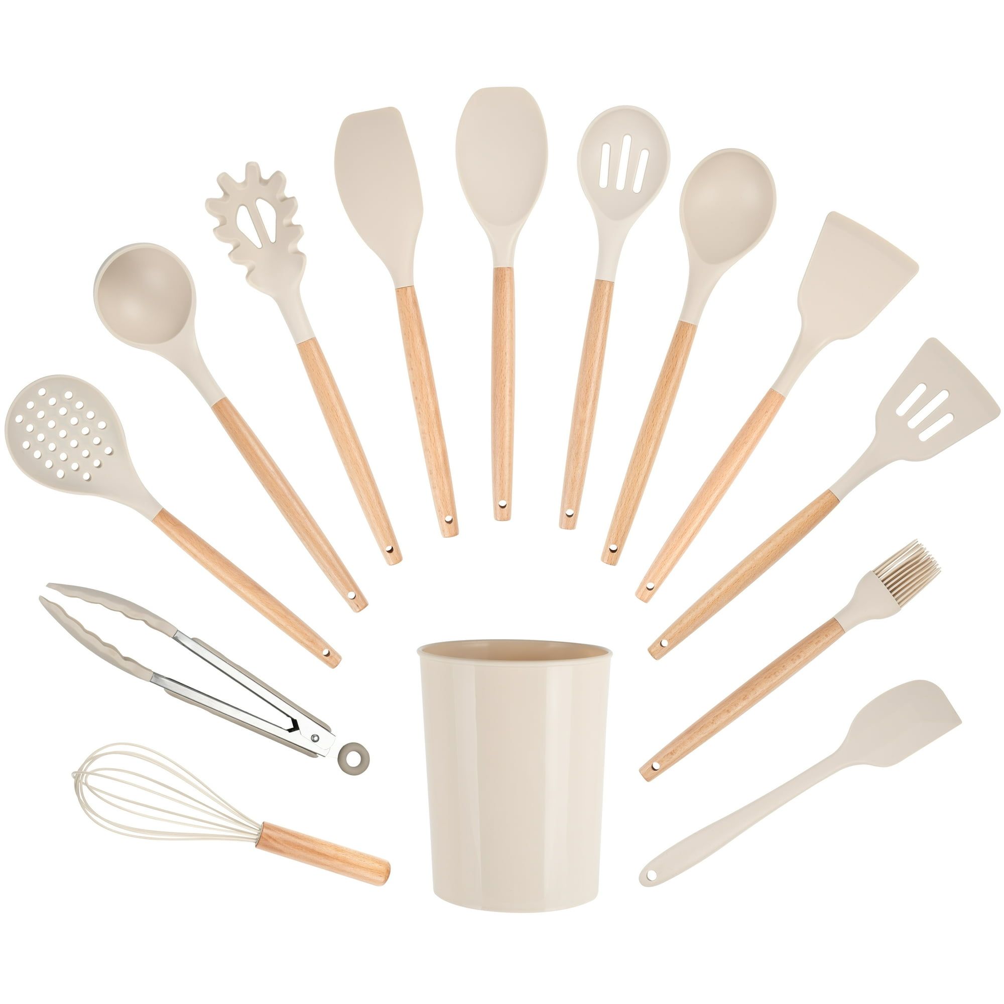 Product detailsThe Mainstays kitchen utensils set makes cooking easier. It guarantees that you have the right tool for the job, and it enhances the enjoyable moments spent with your family. This set covers all your cooking needs, whether you’re baking or cooking. It is a reliable companion in the kitchen. The flexible spatula, food tongs, and utensil holder can be safely washed in the dishwasher. Other utensils with wooden handles should be washed by hand.HEAT-RESISTANT, NON-MELTING, WOODEN HANDLE - Mainstays cooking utensils set are heat-resistant, ensuring they won't melt or produce smoke even in high-temperature frying. The comfortable wooden handle prevents heat transfer, providing a safe cooking experience. This is the go-to basic cooking set for a new home or apartment. SAFE, BPA FREE, FOOD GRADE SILICONE, ODORLESS - Mainstays cooking utensils set is made of high-quality food-grade silicone that is BPA-free and odorless. These silicone utensils for cooking do not react with food or beverages, even at high temperatures.FULLY MEET YOUR KITCHEN NEEDS, NO MORE WASTE OF MONEY - Mainstays utensils set includes 13 tools and a large utensil holder. You will have all the essential cooking tools you need in your kitchen. It includes a ladle, solid spoon, slotted spoon, flexible spatula, pasta server, slotted turner, solid turner, and more. These silicone utensils protect non-stick pans from scratches.NO GAPS, EASY TO CLEAN - The one-piece design eliminates any gaps where food can get trapped, making cleaning a breeze. Please note that due to the wooden handle, these silicone kitchen utensil set for non-stick pan are not suitable for dishwasher cleaning. However, the flexible spatula, food tongs, and utensil holder are dishwasher safe.GIFT IDEA: Mainstays kitchen utensils set makes a thoughtful and practical gift for anyone passionate about cooking. Whether it's a housewarming party, wedding, or any special occasion, Mainstays kitchen utensils set is sure to be appreciated.